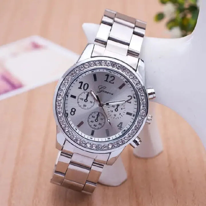 Geneva women’s quartz watch with stainless steel band and crystal detail—elegant for daily wear or gifting. Stock: 10 units.